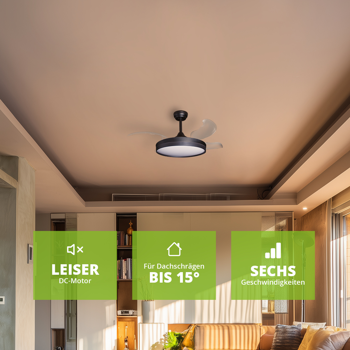 Die Kombination aus wechselbarer LED-Abdeckung, verschwindenden Rotorblättern und smarter Technologie macht den Ventilator zu einem vielseitigen Einrichtungsstück: flexibel in der Optik, ressourcenschonend in der Nutzung und funktional für alle Jahreszeiten. Sie investieren einmal in ein Gerät, das sich Ihren Bedürfnissen und Ihrem Stil anpasst – für langfristige Freude und maximale Nachhaltigkeit.