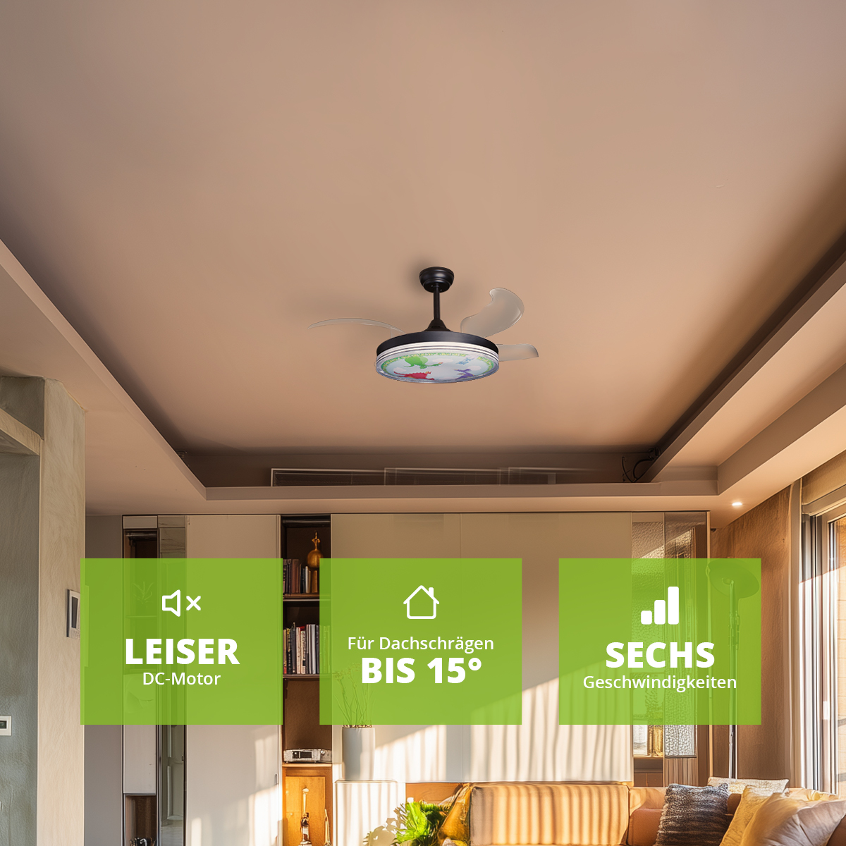 Darüber hinaus überzeugt der Ventilator durch unsichtbare Rotorblätter, die sich bei Nichtbetrieb elegant zurückziehen. Im Alltag fungiert das Gerät dann als stilvolle Lampe, die sich harmonisch in jeden Raum einfügt, ohne die Funktion eines Deckenventilators sichtbar zu machen. Dieses technische Detail ist ein Alleinstellungsmerkmal, das weit über die klassischen Funktionen anderer Ventilatoren hinausgeht.
