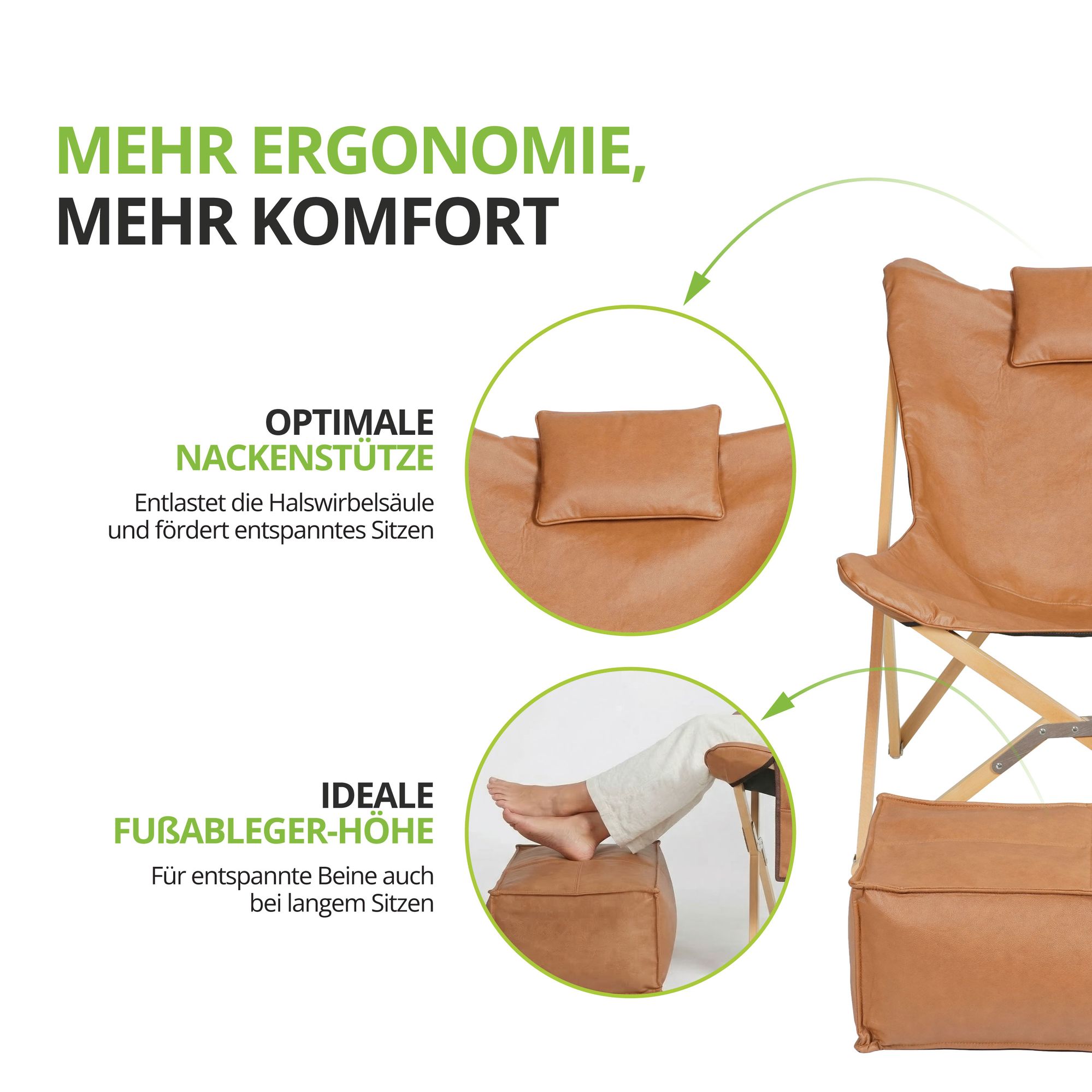 Durch die Kombination entsteht eine deutlich entspanntere Sitzposition, da die Beine hochgelagert werden können. Das entlastet den Körper und sorgt für ein ruhigeres, komfortableres Liegegefühl im Stuhl.