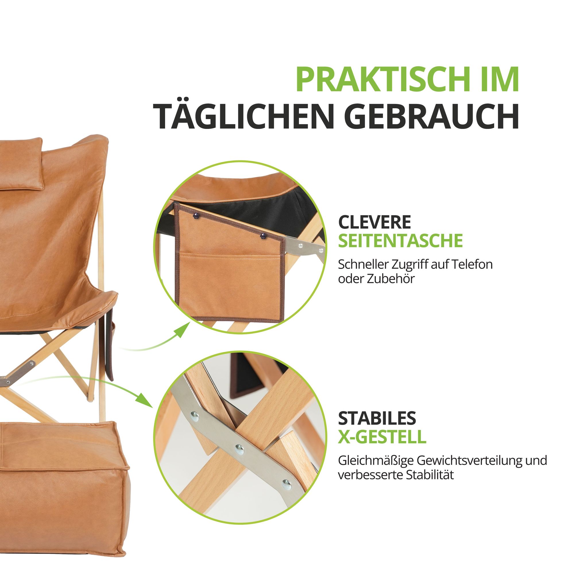 Das Set besteht aus einem klappbaren Relax- und Loungestuhl sowie einer passenden Fußstütze. Beide Elemente sind aufeinander abgestimmt und bilden gemeinsam eine flexible Sitz- und Entspannungszone für Innen- und Außenbereiche.