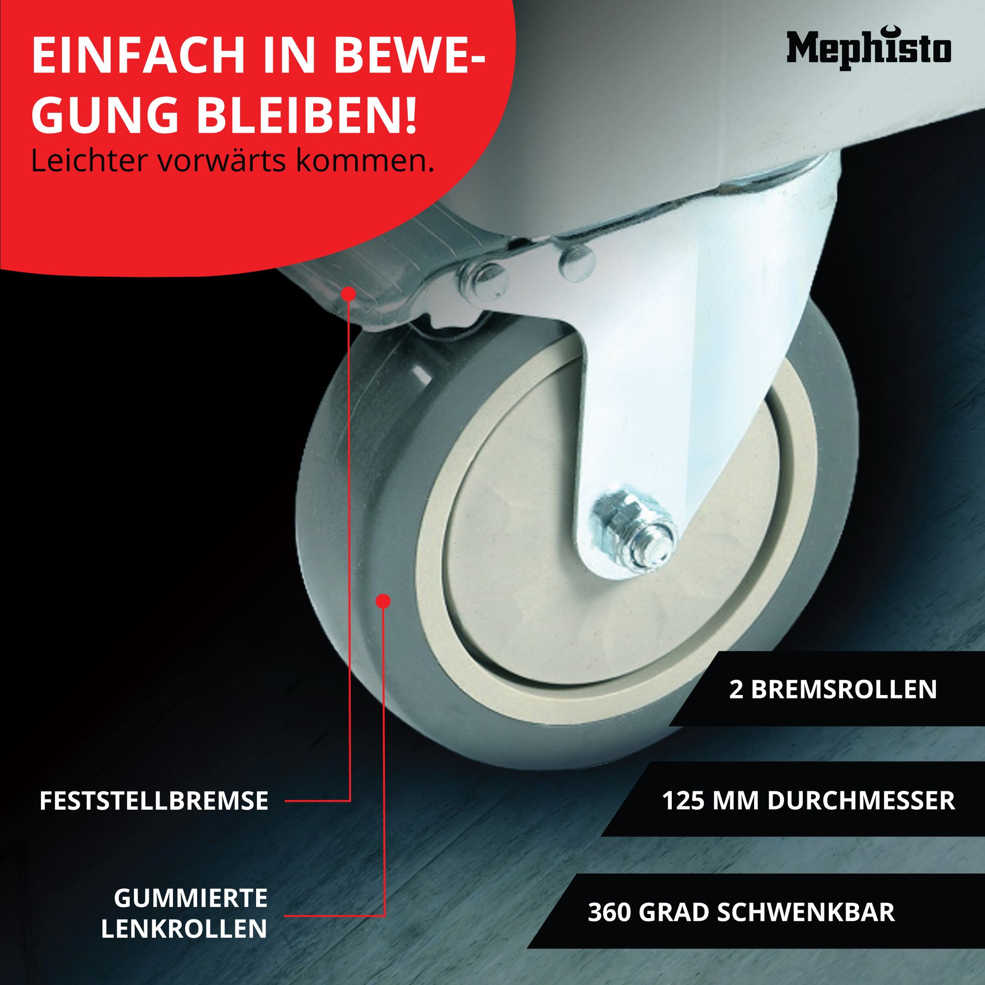 4x kugelgelagerte Rollen mit gummierter Beschichtung, Ø der Rolle 125 mm, (2 Rollen mit Feststellbremse, 360° schwenkbar, somit leicht lenkbar)