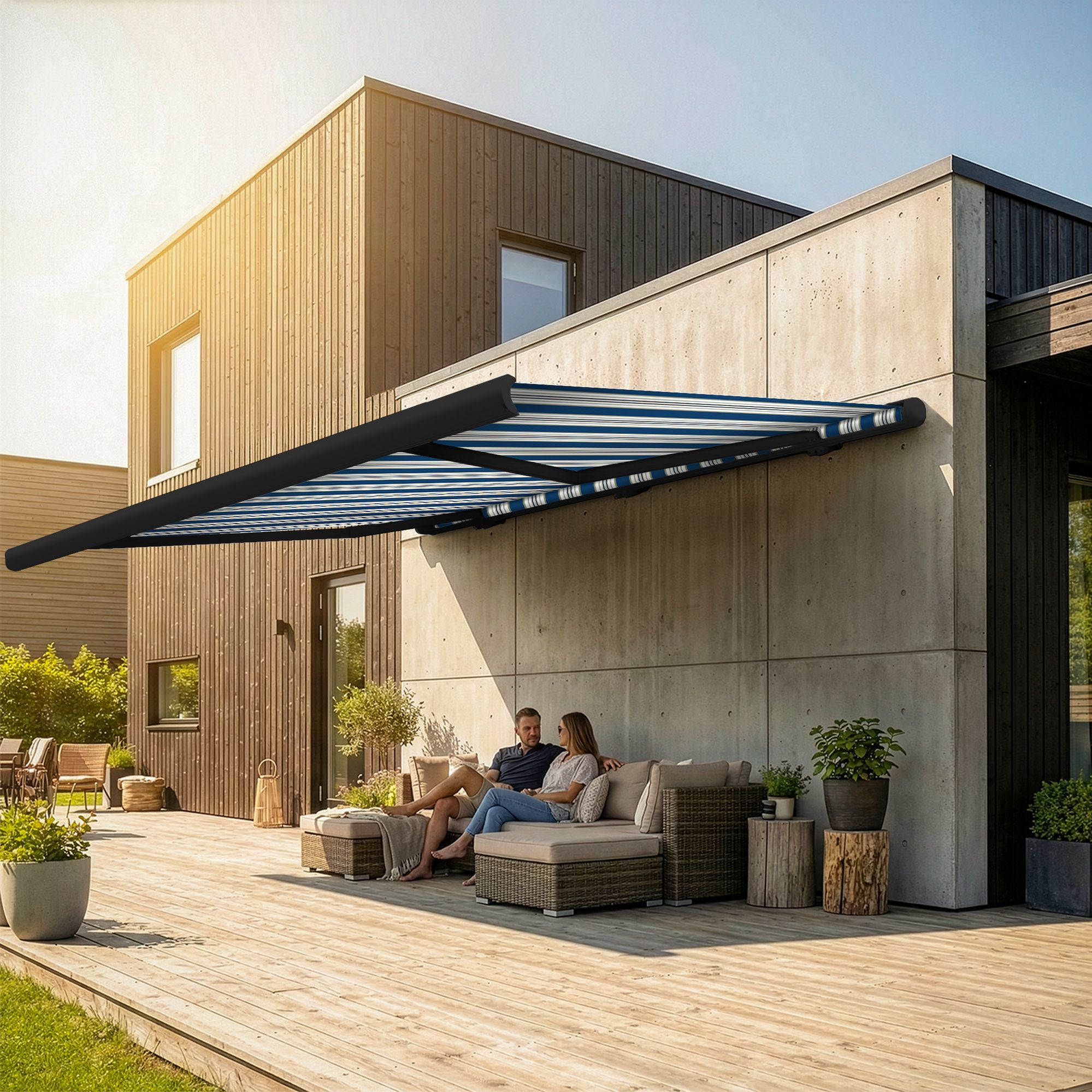 Dank geschlossener Vollkassette, leistungsstarkem Motorantrieb und optionaler Automatisierung ist diese Markise eine Premium-Lösung ohne Luxusaufschlag.