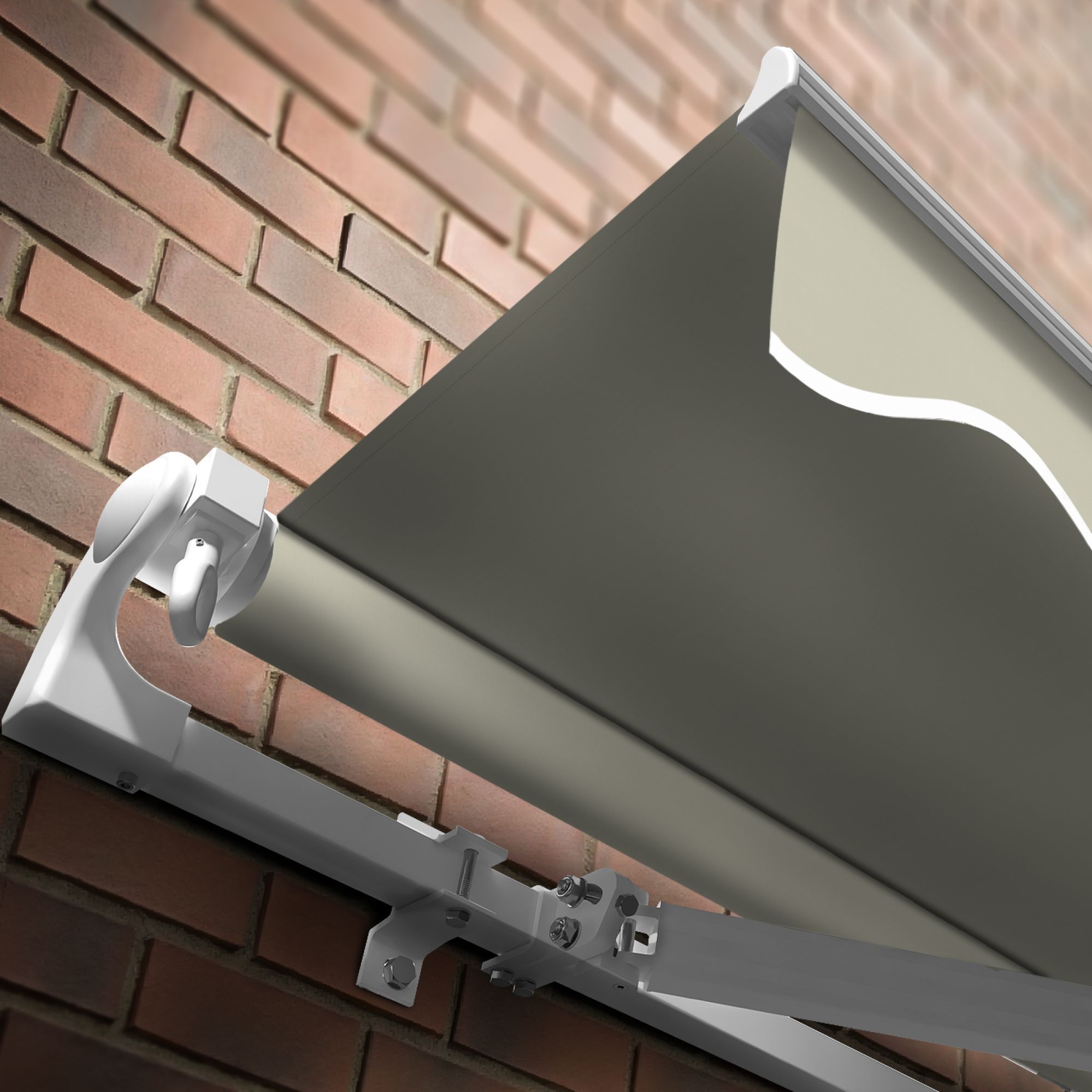 - Wandhalterungen sind aus Aluminium, mit gleichfarbigem, zur Markise passenden Pulverlack beschichtet