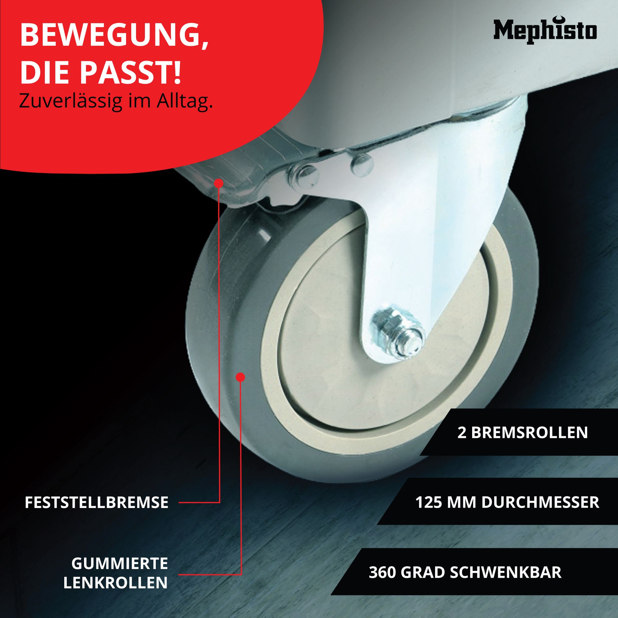 4x kugelgelagerte Rollen mit gummierter Beschichtung, Ø der Rolle 125 mm, (2 Rollen mit Feststellbremse, 360° schwenkbar, somit leicht lenkbar)